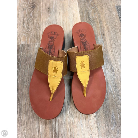 -Sandals Heels Platform By Fly London In Blue & Yellow, Size: 9