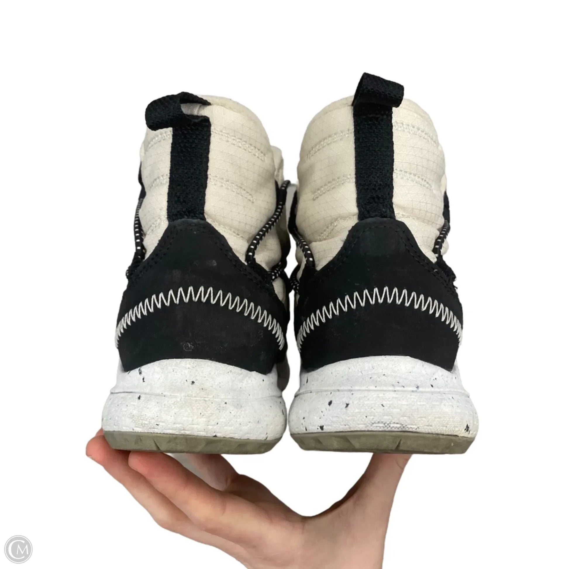 Step out in style in these Merrell black and cream snow boots, size 6. Stay chic and cozy all winter long.