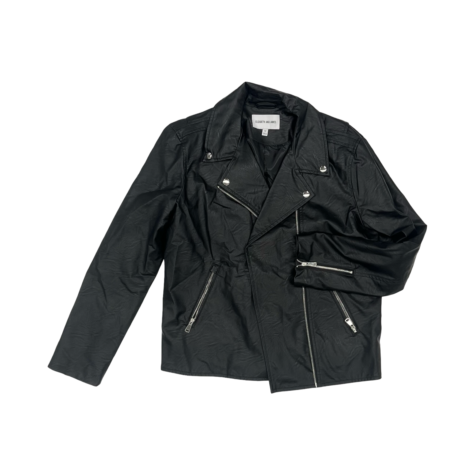 The Elizabeth and James black Moto jacket in size M exudes timeless sophistication and durability, making it a versatile wardrobe staple.
