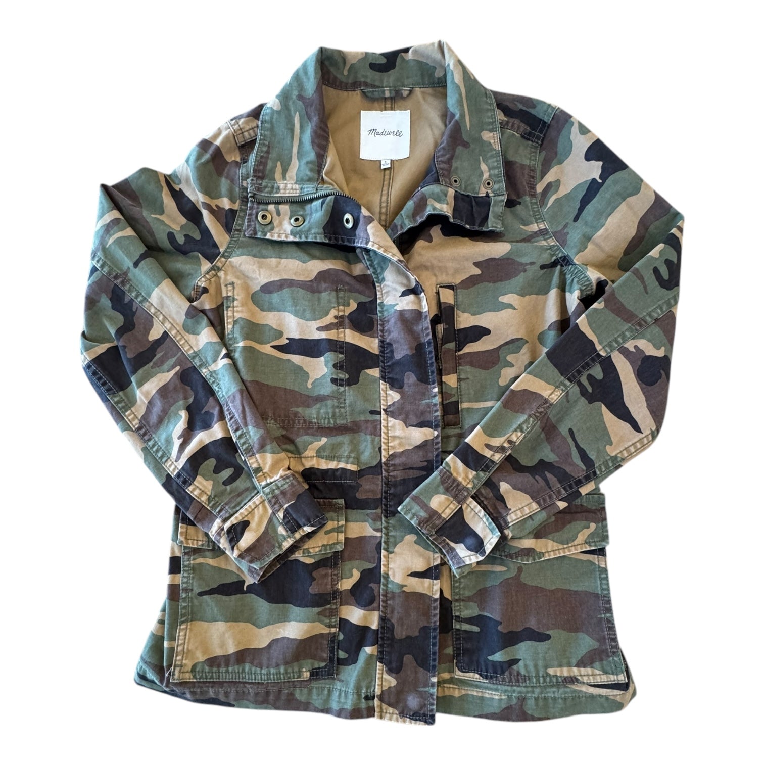 Madewell's Camouflage Utility Jacket in Size 4 adds a rugged edge to your wardrobe effortlessly.