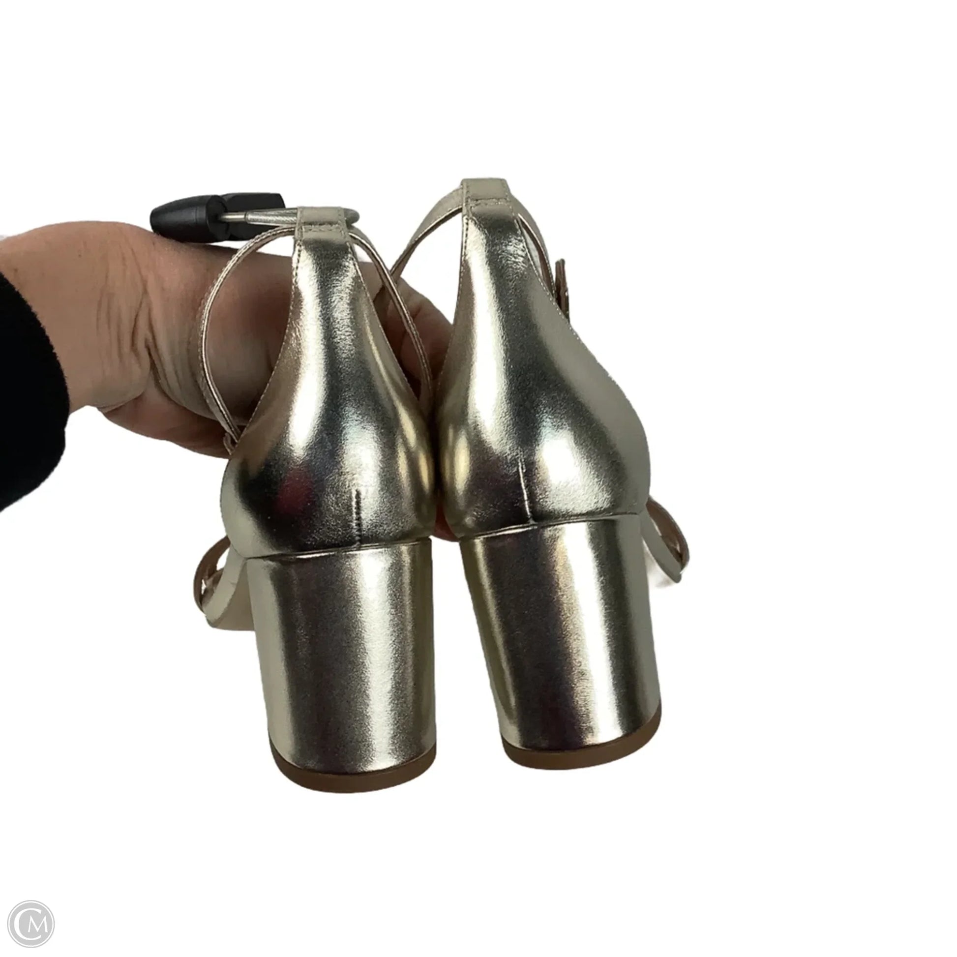 Step into the spotlight with the dazzling Gold Block Heel Sandals by Cole Haan, Size 8.