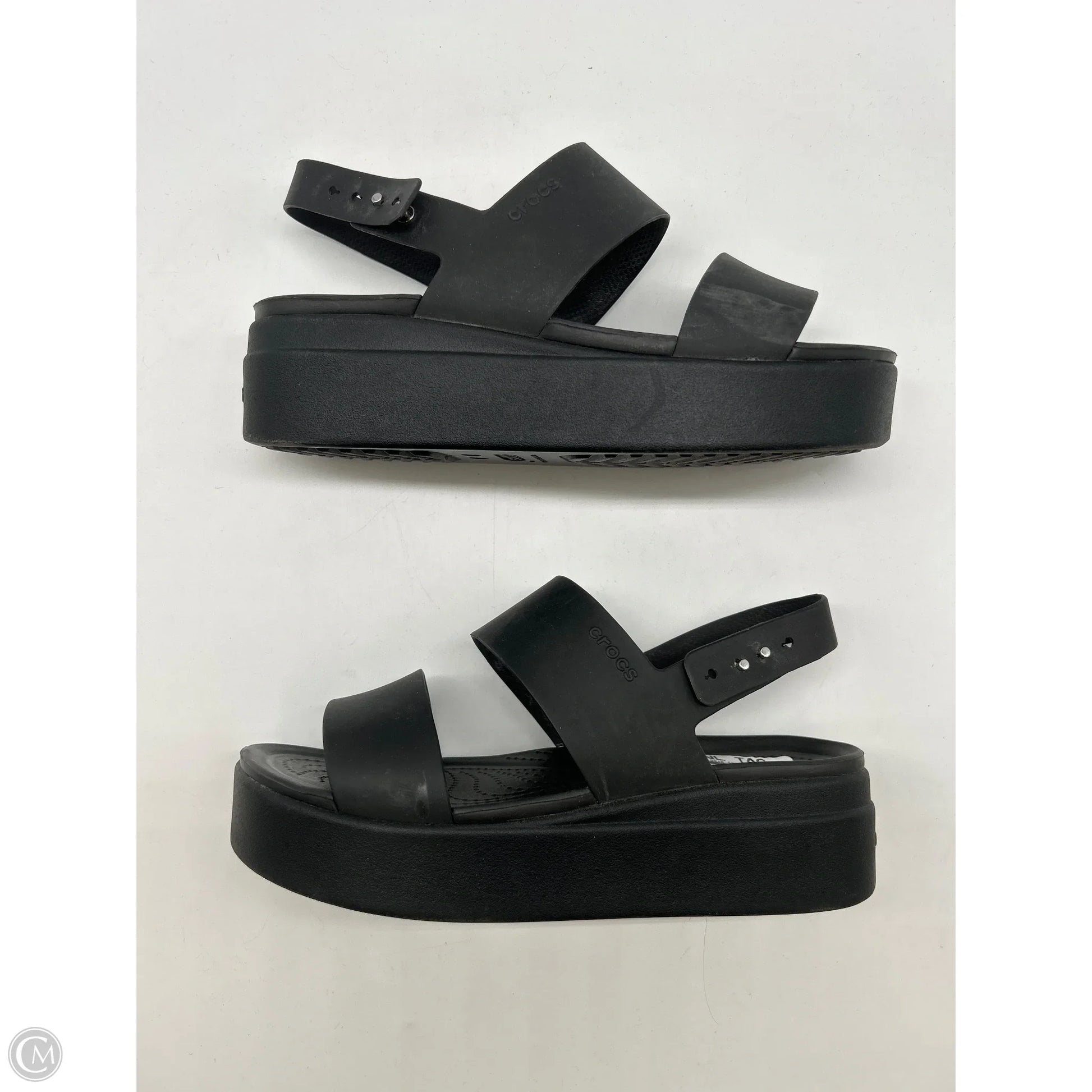 Step into sophistication with Crocs' black platform sandals, size 8. Elevate your look with luxurious style.