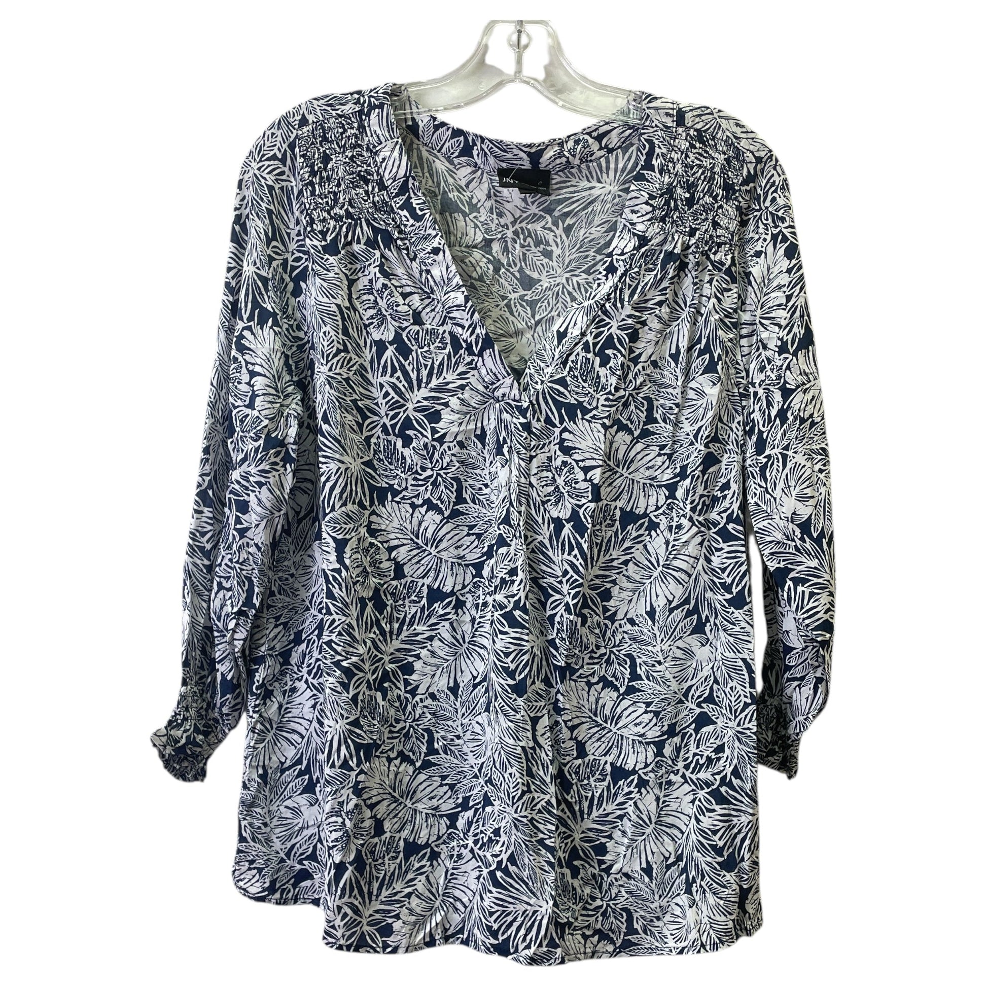 Experience timeless elegance with the Jones New York Top in Blue & White, Size L. Effortlessly stylish and versatile for any occasion.